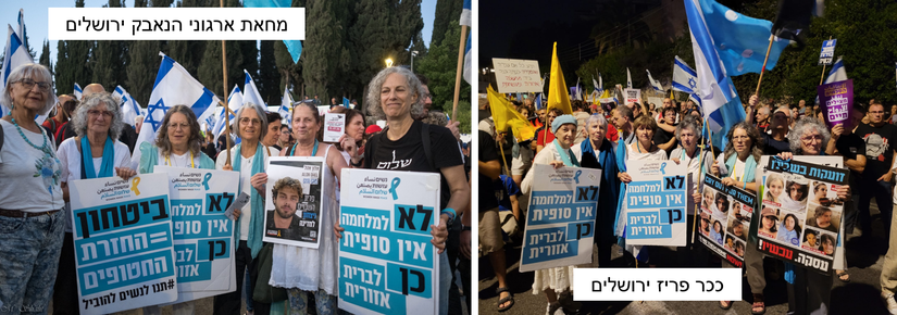 | יצאנו להפגין להקמת ממשלה חדשה שתבצע עסקה, ממשלה שתפסיק את המלחמה ושתשב למשא ומתן כדי להבטיח לכולנו חיים של שלום וביטחון. צעדנו בכל צעדה אפשרית ובכל מחאה הקוראת לעסקה עכשיו, לסיום המלחמה ולהסכם מדיני לשלום ע כ ש י ו. היינו בקפלן, בכפר סבא, בקיסריה, בירושלים ובמוקדים נוספים. |