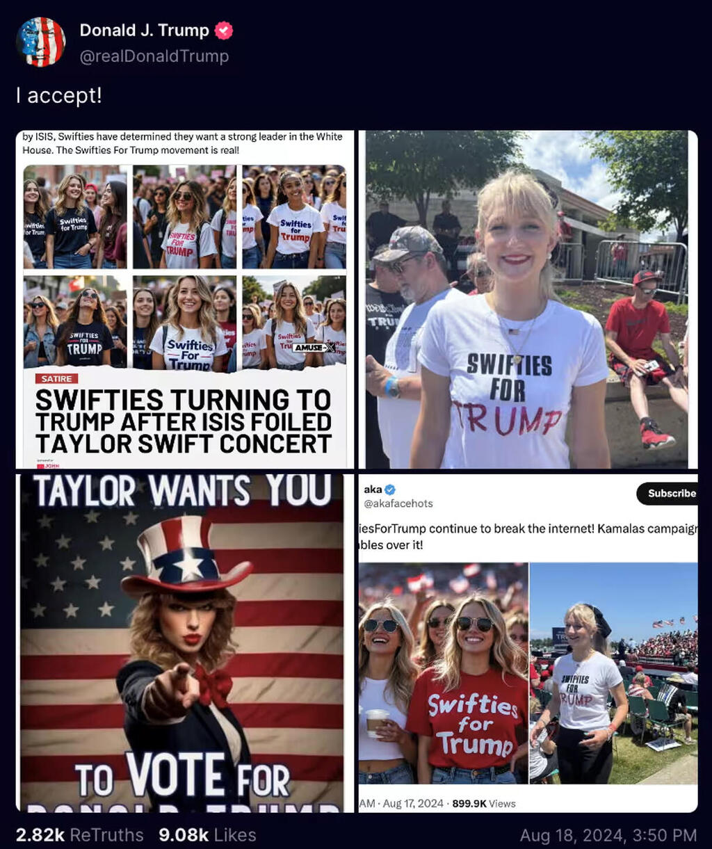 אנשי הקמפיין של דונלד טראמפ זייפו, בעזרת כלי AI, תמונות של טיילור סוויפט ושל חיילות מצבא המעריצות שלה (המכונות הסוויפטיות) כשהן תומכות כביכול בטראמפ. הסוויפטיות הזועמות כתבו ב X (טוויטר לשעבר) בין השאר: "סוויפטיז, עכשיו זו ההזדמנות שלכן להשמיד את טראמפ ואת ה AI במכה אחת. נוצרתן לזה. אתן הצבא שאנחנו צריכים" ו "סוויפטיות אמיתיות שונאות את דונלד טראמפ. את לא יכולה להיות סוויפטי ולתמוך בפושע מורשע, זה לא יכול להתקיים בו-זמנית". הוציאו את הפופקורן.