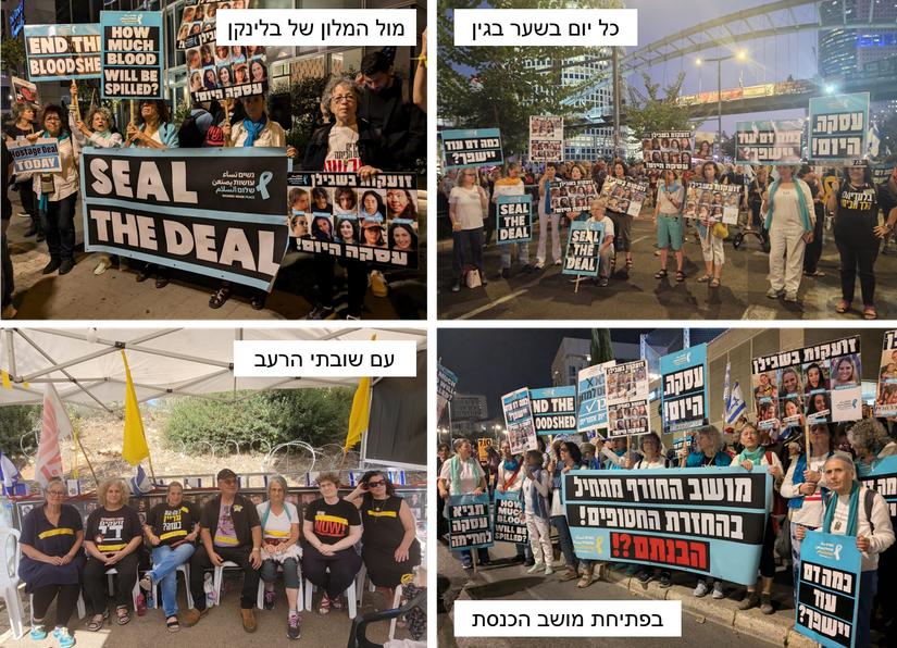 | גם החודש המשכנו לתמוך במשפחות החטופים, ולקרוא לעסקה, במגוון דרכים ובכל רחבי הארץ. בשער בגין, תל אביב אנו זועקות עם משפחות החטופים כל יום! בין 19-20.30 כבר מעל שנה. ישר כח לאורלי כהן, לחיה אבו, מנו רוטשטיין ועפרה פרל דקל מהצוות המארגן והמסור. ב 10.10 הצטרפנו לצעדת הזעם של מחאת הנשים מהבימה עד שער בגין וזעקנו - רק עסקה תציל את החטופים, העתיד יתחיל עם שובם! ב 22.10 עמדנו מול מלון קמפינסקי בתל אביב שם נפגש אנטוני בלינקן עם משפחות החטופיםכדי לעודד, לתמוך ולהבהיר שיש בישראל ציבור הדורש לשים סוף להפקרת החטופים ולהֶרג אזרחים בעזה. בירושלים אנו עומדות במרכזי השכונות בימי שישי וערבי חג בצהריים וקוראות את שמות החטופים ובמוצ"ש תומכות במשפחות בכיכר פריז. הגענו לתמוך בשובתי ובשובתות הרעב למען החזרת החטופים במאהל מול הכנסת שיזמה חברת התנועה אורנה שמעוני. בין השובתות גם רחל סוויסה, חברת התנועה ששבתה-רעב 14 ימים: ״הבנתי, מתוך דחף פנימי, שזה משהו שאני צריכה לעשות, אני כל הזמן חושבת על החטופים.״ כך אמרה רחל בראיון ברשת ב' גם ב-28.10 עלינו שוב לירושלים מכל קצווי הארץ עם פתיחת מושב הכנסת כדי להזכיר לחברי הכנסת שמושב החורף מתחיל בהחזרת החטופים. קראנו ל"עסקה עכשיו" גם בכפר סבא שם נשאה דברים ד"ר יעל אדמי, בזכרון יעקב, קיסריה, גדרה, מודיעין ובמוקדים נוספים ברחבי הארץ. |