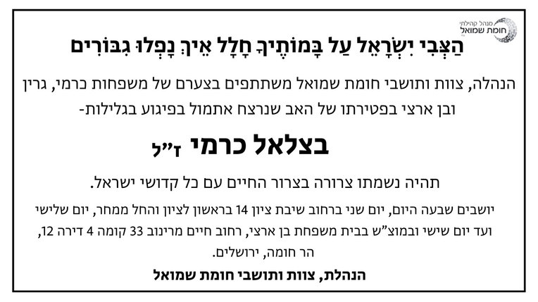 | ברוך דיין האמת תושבי חומת שמואל משתתפים בצערם של משפחות כרמי, בן ארצי וגן. מחבקים בשעה קשה זו. |