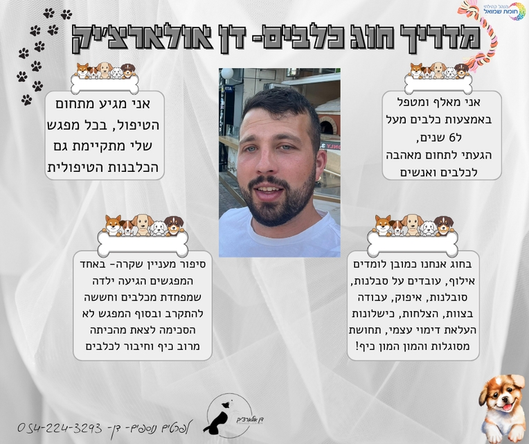 | תושבים יקרים, החלטנו לפתוח בפינה חדשה, בה תוכלו להכיר את מדריכי החוגים שלנו מקרוב. הכירו את דן אולארצ'יק- מדריך חוג כלבים |