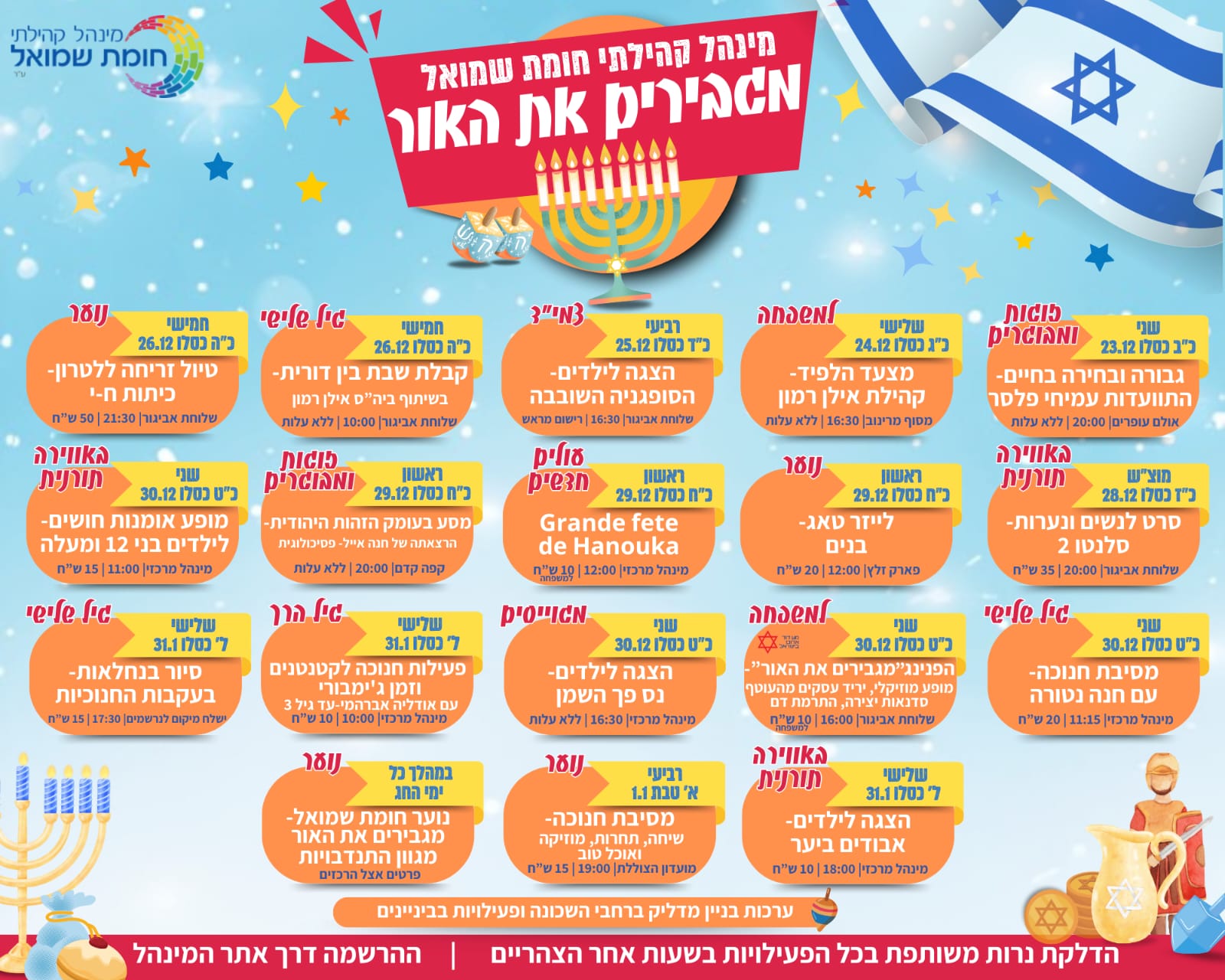 | תושבים יקרים, מוזמנים להירשם למגוון אירועי חנוכה, בואו להנות ולצבור חוויות!