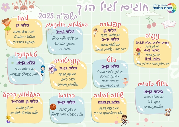 יום ראשון, ב אדר, 2.3 קבוצה ראשונה מ16:30-17:30 לילדי הגן עם הורה מלווה, קבוצה שניה מ17:40-18:40 לילדי היסודי