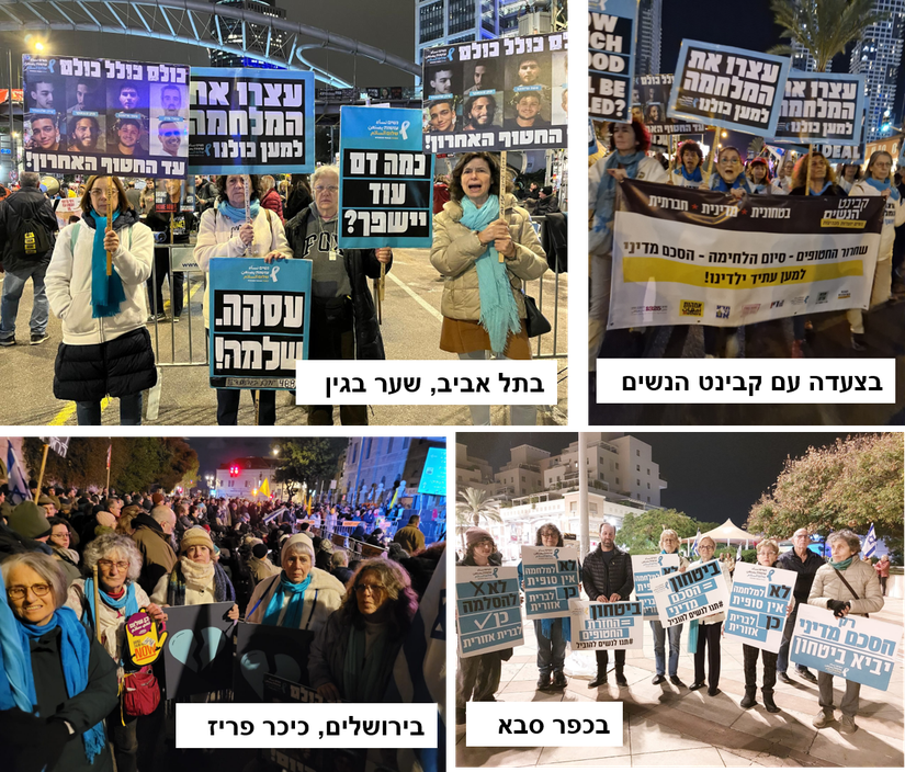אנחנו עומדות במרחב הציבורי במוקדים רבים ברחבי הארץ, ודורשות לקדם הסכם מדיני למען בטחוננו. חייבים להחזיר את החטופים! חייבים להתקדם למהלכים מדיניים!