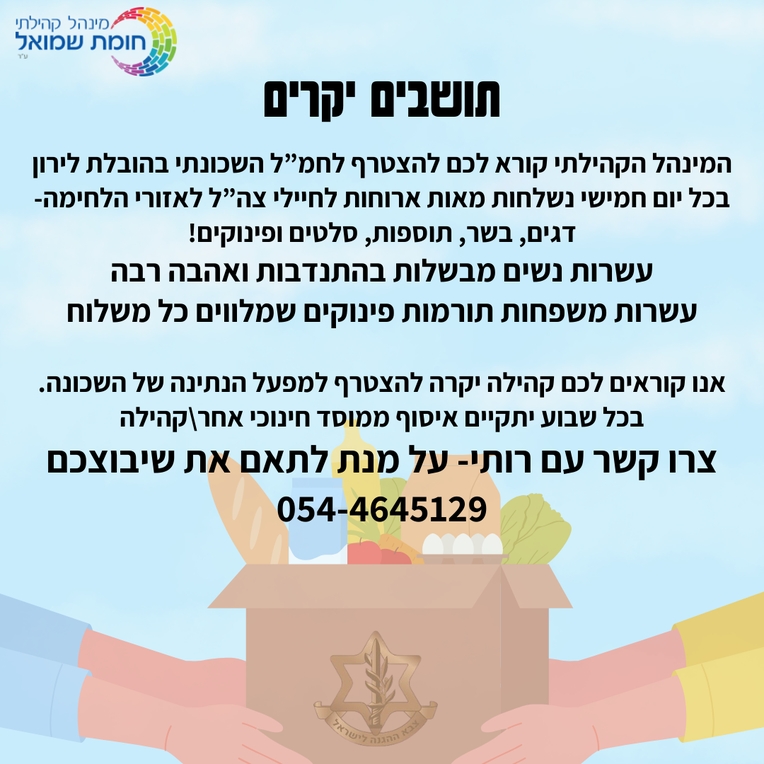 | תושבים יקרים שימו לב! בהתאם ללוח החופשות החל מיום שישי ו' ניסן 4.4 ועד למוצ"ש כ"א ניסן 19.4 לא יתקיימו חוגים!! נחזור לפעילות מלאה החל מיום ראשון כ"ב ניסן 20.4 חג שמח! |