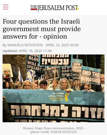 | 1. טור דעה בג'רוזלם פוסט מנו רוטשטיין, חברה בנשים עושות שלום שאלה ארבע קושיות נוקבות את ממשלת ישראל, בטור דעה בג'רוזלם פוסט. מה יהיה גורלם של בני הערובה? האם לא ברור כבר שאנו לקראת אותו מבוי סתום? האם יש אפשרות אחרת חוץ ממלחמה אין סופית? האם זו באמת מלחמה של אין בררה? קראו את הטור המלא כאן | | |