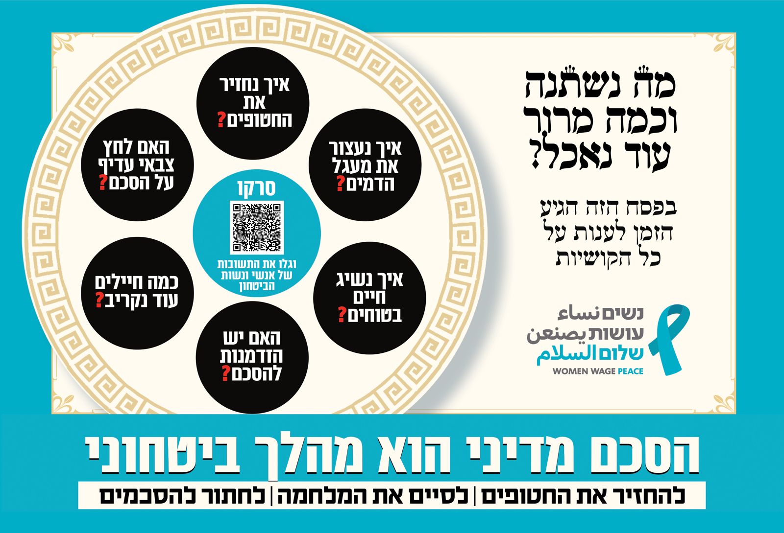 | 2. כמה מרור עוד נאכל? כחלק מהקמפיין "הסכם מדיני הוא מהלך ביטחוני" שסיפרנו עליו בידיעון החודש הקודם (גם ראו כאן) יצאנו בערב חג פסח בפרסום בעיתונות המודפסת בקריאה לעצור את המלחמה, לשחרר את החטופים, להגיע להסדר מדיני. בפסח הזה הגיע הזמן לענות על הקושיות - איך נחזיר את החטופים? איך נעצור את מעגל הדמים? כמה חיילים עוד נקריב? איך נשיג חיים בטוחים? |