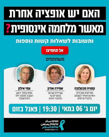 | בימים אלה, מחיר המלחמה הממושכת זועק מתמיד. בתוך המציאות הבלתי נתפסת אליה נקלענו, חובה עלינו לדון בחלופות המדיניות העומדות בפנינו. ביום ג׳ הקרוב, ה- 6 במאי, בשעה 19:30ֿ, נקיים פאנל בזום בנושא: האם יש אופציה אחרת מאשר מלחמה אינסופית? הפאנל בהשתתפות: עמי אילון. אלוף במיל, לשעבר ראש השבכ ומפקד חיל הים אמירה אורון. שגרירת ישראל במצרים עד נובמבר 2024 קסניה סבטלובה. מזרחנית, מנכ"לית הארגון האזורי לשלום כלכלה וביטחון | | |