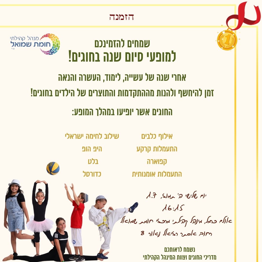 | הורים יקרים! מוזמנים למופע סיום שנה בחוגים! המופע יתקיים בחלק מאירוע פתיחת הקיץ במינהל הקהילתי. סדר מופע חוגים: 1. כדורסל 16:15 2. אילוף כלבים 16:25 3. בלט 16:35 . 4היפ הופ 16:45 5. קפואירה 16:55 6. התעמלות קרקע 17:05 7 התעמלות אומנותית 17:10 8. שילוב לחימה17:20 ניפגש! |