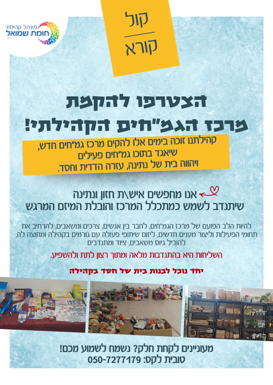 - ובעיקר: להפוך את מרכז הגמ"חים ללב פועם של חסד בקהילה