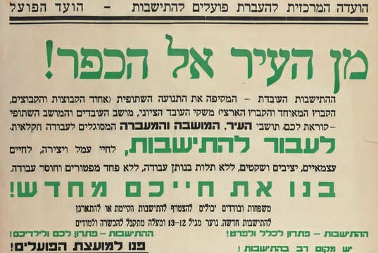 תכנית ההתיישבות של בן גוריון נחלה הצלחה: ההסתדרות הפעילה באמצעות מועצות הפועלים ברחבי הארץ מנגנון תעמולה נרחב, ובתוך פחות מחצי שנה נרשמו לתוכנית כ4,000 נפש, 59% מהם היו ילידי הארץ או עולים וותיקים, שהיו מסודרים במקצועות מכובדים כגון פקידי ממשלה ומוסדות עירוניים, בעלי מלאכה או פועלי בניין וותיקים, והשאר היום עולים שהגיעו למדינה בתחילת שנות ה-50. בשש שנות הפעילות הראשונות הקימה תנועת "מן העיר אל הכפר" 17 מושבים ושיכנה בהם את חבריה. המושב הראשון, שדי חמד, הפך למושב משגשג בו חיים כיום כ1,000 נפש והוא ממוקם כיום באשכול השמיני (מתוך עשר) במדד החברתי כלכלי. | | | | "אני מבקש סליחה" מאת: דייויד סלע