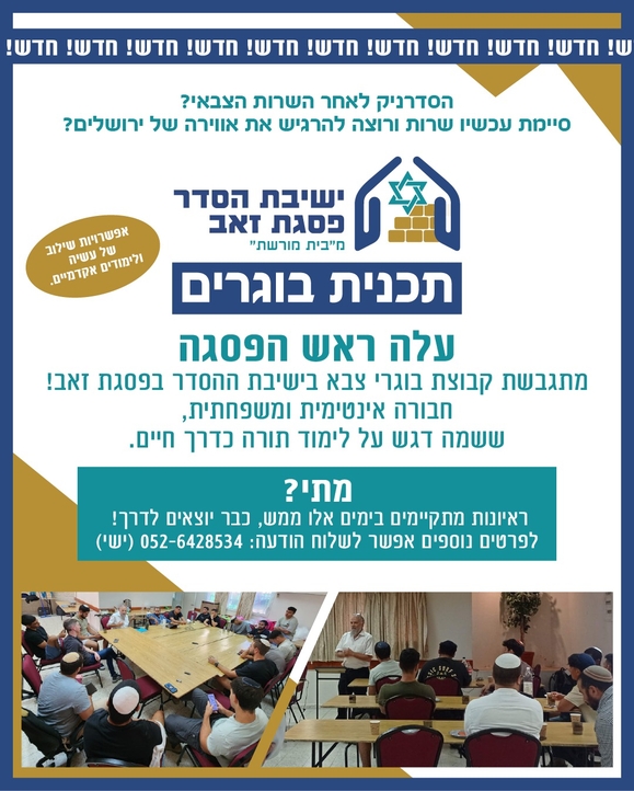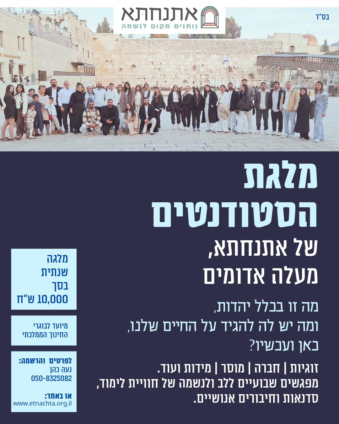 מחכים להיפגש, צוות התלמוד תורה. | | | מסע בעקבות דוד המלך במכינה החדשה בפסגת זאב | | | המכינה החדשה שלנו, מכינת צור משה בפסגת זאב, פתחה את זמן חורף במסע מיוחד – מסע דוד – מבריחה למלוכה, מסע של יומיים במדבר יהודה. צעדנו בעקבות דוד המלך, למדנו ברגליים, התחברנו והתגבשנו. ועכשיו, בכוחות משותפים, מסתערים על זמן חורף, בתפילה לצמיחה משותפת, למען העם והארץ. תלמידי י"ב ומתעניינים במכינה לשנה הבאה? תלמידי שיעור א' ומחפשים לחבור לחבורה איכותית? מוזמנים לפנות כבר עכשיו לרב שמואל פרץ, ראש המכינה: 052-3132494 | | | | מקומות אחרונים בהחלט במלגת אתנחתא | | מלגת אתנחתא, מלגה של 10,000 ש"ח לשנה, המיועדת לסטודנטים ולסטודנטיות בוגרי החינוך הממלכתי. תודה גדולה לכל השותפים במעלה אדומים, ובהם ראש העירייה גיא יפרח, על ההיתרמות ליישום התכנית. מעוניינים להירשם או לשמוע יותר פרטים? מכירים מועמדים ומועמדות מתאימים? מלאו פרטים ונחזור אליכם.