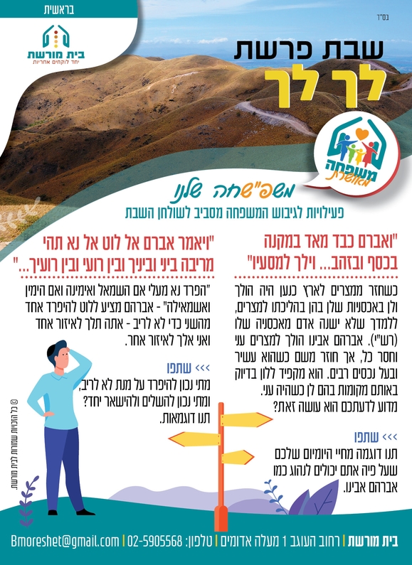 | | | | חוג אפייה במועדונית צמי"ד | | במועדונית צמי"ד הפועלת באולפנת צביה ומעניקה מענה חברתי ורגשי לילדים וילדות עם צרכים מיוחדים, נהנו החברים השבוע מחוג אפייה חווייתי, בליווי המתנדבות בנות האולפנה. המועדונית פועלת עבור הילדים כל ימות השנה ומעניקה להן מקום מפגש חם, מלא חוויות והתנסויות. | | | | מעשירים את שולחן השבת | | דפי שיח לשולחן השבת דרך שאלות לכל המשפחה דרך הפרשה – והפעם, פרשת לך לך: על ריבים ונכסים. לחצו והורידו את הדף. | | | |