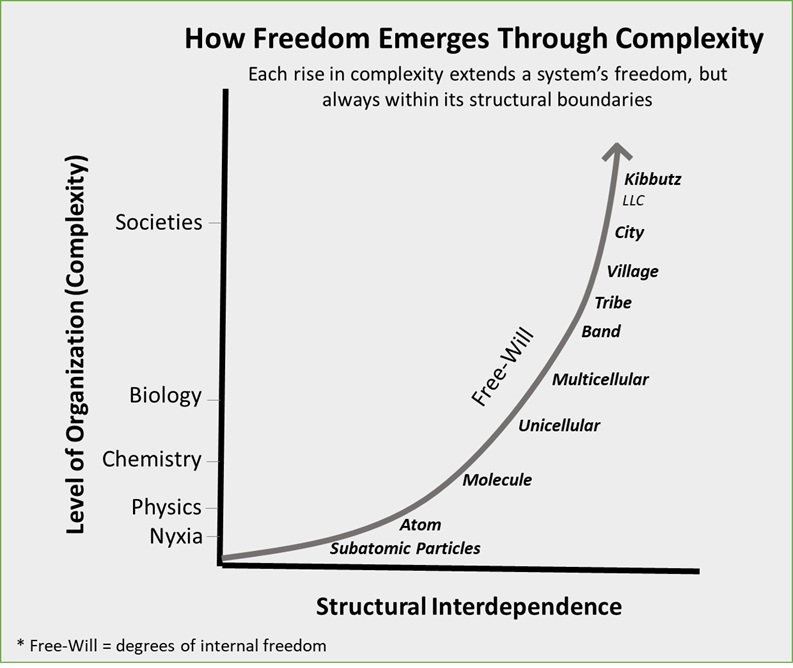 The Law Beyond Mechanics According to the Universal Law of Increasing Complexity, the universe evolves from low to high order, from simplicity to structured richness. This overall trajectory is determined, yet within it exists room for freedom at every level of existence. A subatomic particle does not follow a single predetermined path but exists as a spectrum of lawful possibilities until interaction selects one, while molecules add further freedom through the many configurations in which atoms can bind and stabilize. Cells inherit this flexibility and transform it into adaptive behavior, maintaining coherence amid continuous change. Conscious beings extend it further by anticipating multiple futures before choosing among them, and societies amplify it collectively by aligning many minds around shared direction. With each rise in complexity, the number of coherent possibilities and the capacity for internal freedom expand, revealing that freedom is not the absence of law but its most refined expression. Freedom therefore grows with complexity, yet always remains within the boundaries of law. The direction of the universe is predetermined, but the path it takes can vary and accommodate choice. Determinism provides the structure of motion, while freedom gives it orientation and meaning. As expressed in the Jewish parable from Avot (3:15), “Everything is expected, yet permission is given”, a concise acknowledgment that although events unfold within law, every moment still carries the power of decision. To understand how this universal principle manifests in living and human systems, we now turn to the structures through which freedom becomes agency. The Architecture of Agency Every structure that endures does so because it maintains direction within law, an internal orientation that keeps energy and structure aligned toward a shared purpose. When that orientation weakens, coherence begins to break down, and the system loses its ability to stay together. The same principle that governs the atom governs civilization: stability relies on the ongoing renewal of alignment among energy, structure, and direction. Whenever this renewal stalls, decline happens not as failure or punishment but as the natural result of structural imbalance. The same structural logic that governs matter also governs human prosperity. A society that rejects free will abandons its internal causality. It loses faith that change is possible and, along with it, the mechanisms that make change real. Courts then view wrongdoing as inevitable, governments see poverty as destiny, and citizens accept limitations as if they were natural. Fatalism replaces intention, and motion continues without progress. I have seen this not only in theory but also in real life. When I asked smallholder farmers in Africa about their dreams, many couldn't name even one. Their silence was not due to ignorance but resignation, an acceptance of reality as it is, a quiet surrender that happens when imagination is replaced by endurance. The absence of a dream isn't just a mental state but a sign of structural loss of hope, the same paralysis that occurs when systems forget how to envision the future. It's not just poverty of income but poverty of direction, a loss of the internal ability to shape what comes next. When this condition spreads through a society, the triad that sustains all living systems - feedback, anticipation, and coherence - begins to fall apart. Feedback allows systems to learn from the effects of their own actions; anticipation helps them prepare for likely future states, such as a cell activating defenses before damage occurs or a market adjusting prices ahead of shortages; coherence maintains internal stability as these adjustments happen. When any one of these elements weakens, the system loses its ability to guide its own evolution. Without feedback, there is no learning; without anticipation, no purpose; and without coherence, no continuity. The outcome is not stability but stagnation masquerading as order, a state that appears balanced while hiding decay. Economies are social systems that follow the same triadic law: feedback through markets, anticipation through investment, and coherence through trust. From the earliest tribes to the most advanced institutions, human societies have sought a balance between freedom and structure. In tribal communities, cohesion was strong but freedom was narrow; belonging replaced autonomy, and conformity ensured survival. As civilizations grew, feudalism tied people to land and lords, providing stability at the expense of choice. The Kolkhoz reversed the hierarchy but not the control: collective ownership replaced the lord, yet individual freedom remained absent, and innovation could not flourish. The traditional village gave families complete freedom but lacked binding structure beyond kinship, dispersing energy and preventing growth. The limited liability company introduced structured freedom, individual initiative within an organized framework, allowing prosperity to increase through cooperation without coercion. The Kibbutz extended this idea further, creating a society where structure encompassed all aspects of life so that freedom could endure within coherence even beyond the workday. Across these forms, the same pattern appears: systems thrive when freedom and structure advance together and falter when one overtakes the other. The emergence of the limited liability company marked a key moment in human development. It created equality between capital and labor through shared risk and responsibility, giving workers and managers considerable freedom within a clear framework. It formalized structured freedom, allowing complexity to expand without breaking down. This combination of liberty and structure made it the most successful economic organization in history. The Kibbutz expanded on this idea beyond factories and markets. While a company employee is free at work but detached outsi