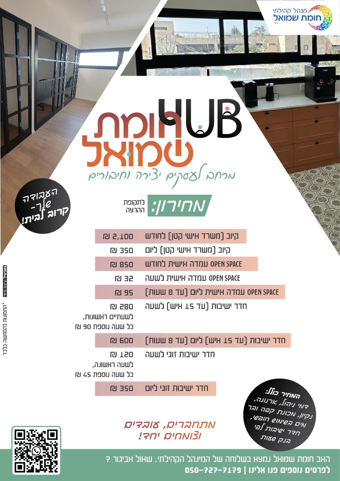 | בקרוב זה קורה! מרחב עבודה, יצירה וחיבורים – בסמוך לבית ובסביבה המעניקה נוחות מרבית. המרחב מיועד ליזמים, לבעלי עסקים, לפרילנסרים ולסטודנטים המבקשים סביבת עבודה איכותית. מה יעמוד לרשותכם ב-HUB? • עמדות עבודה שקטות, מאורגנות ונוחות • חדרי עבודה וישיבות המותאמים לצוותים ולקבוצות • מטבח מאובזר, קפה איכותי ומתקן שתייה • קהילה מקצועית, תומכת ומחברת זהו המקום שבו תוכלו לעבוד, ליצור ולהתרחב ובעיקר לחוש תחושת בית. עובדים. מתחברים. מתקדמים יחד.