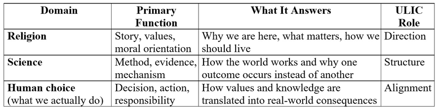 Seen through this lens, the relationship between religion, science, and responsibility can be described structurally rather than ideologically, not as competing worldviews but as distinct functions that together shape human action. The table below summarizes how story, method, and human choice each play a different role in translating meaning and knowledge into real-world consequences.